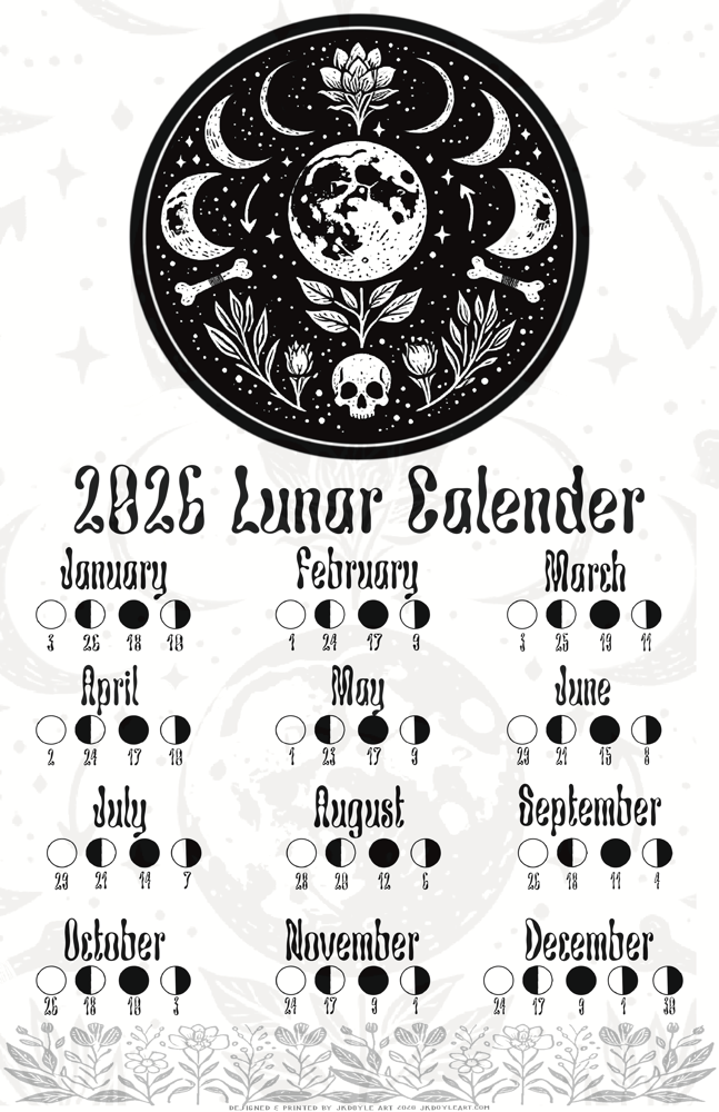 Limited edition Hand printed 2026 Lunar calander. Illustrated by Jk Doyle Printed on French Paper 12x18” stock
